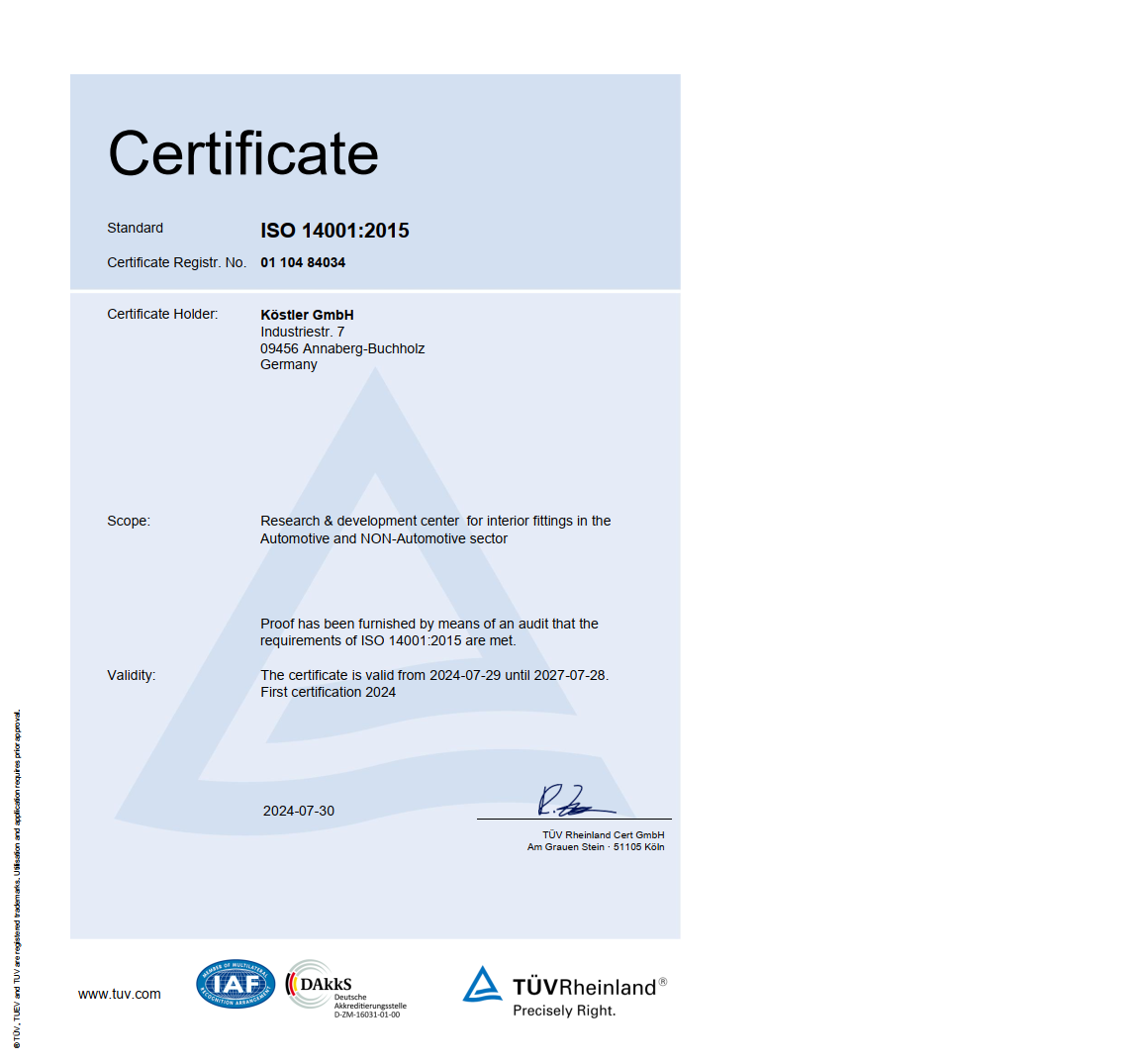 科斯特勒属于第一批德国企业获得了DIN ISO TS 16949 (2003) 认证. 最高的质量意识,清晰结构的过程景观,加上自然环境责任和社会责任,都成为公司主要原则。我们保证全可追溯性。 初步和系列生产质量控制的设施及设备能够进行: 并且我们公司与开姆尼茨技术大学和本地测试实验室。 这里能查看我们证书。 |